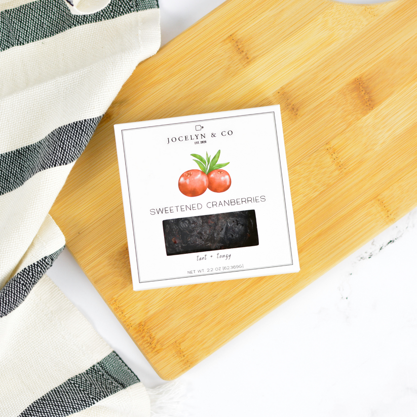 Our sweetened dried cranberries are made with whole fruit and cane sugar—free from preservatives or artificial flavors—and packaged in a sleek 4x4 box with a product window for beautiful shelf appeal.